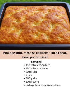 Pre pečenja se po površini rasporede sitni komadići putera. Tokom boravka u rerni oni će se otopiti i stvoriti savršen miris i ukus, kao i blago hrskavu površinu. Prethodno zagrijte rernu na 200 stupnjeva, a pečenje traje otprilike 25–30 minuta. Pita je gotova kada dobije prepoznatljivu zlatno-smeđu nijansu i blago se odvoji od ivica pleha.
