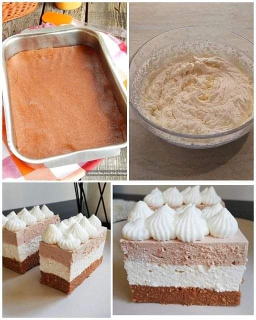 Izmiksajte vrhnje za slag i u njega dodajte otopljenu mlijecnu cokoladu. Premazite preko svijetle kreme i stavite u hladnjak da se dobro ohladi.