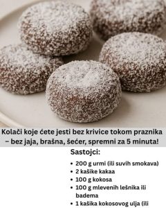 Svaki oblikovani komadić se uvalja u kokos ili mlevene bademe. Ovo ne samo što doprinosi lepšem vizuelnom utisku, već utiče i na samu teksturu – spoljašnji sloj daje blag kontrast mekanoj unutrašnjosti.