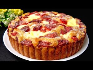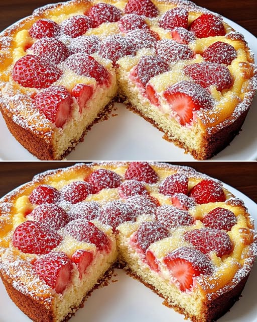 U kalup izlijte tijesto s jagodama i poravnajte ga špatulom kako bi bilo ravnomjerno raspoređeno. Po površini rasporedite ostatak svježih jagoda. Zatim lagano prelijte pripremljenu kremu, pazeći da se prirodno rasporedi bez potrebe za razmazivanjem.