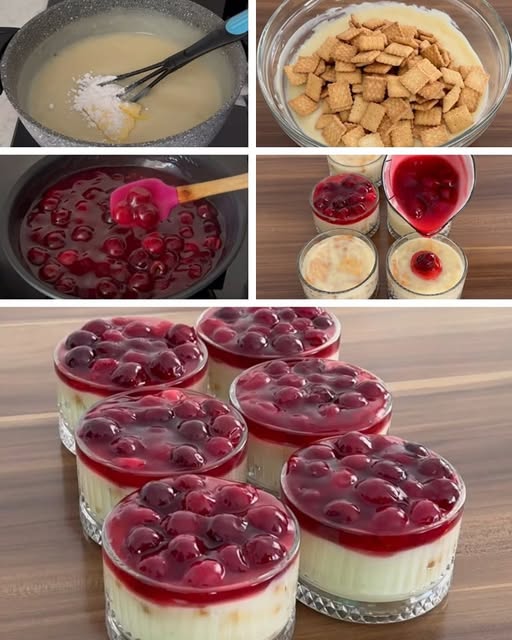 Dok se krema hladi, paralelno se može pripremiti voćni sloj. U srednjoj šerpi se pomiješaju višnje, šećer i voda. Mješavina se zagrijava na srednjoj vatri, a čim proključa, dodaje se kukuruzni škrob razmućen u malo hladne vode (ako je moguće, kako bi se izbjegle grudvice). Smjesa se kuha još nekoliko minuta dok ne postane blago želatinasta, što je znak da je spremna za posluživanje. Ovaj sloj ima osvježavajući, blago kiselkast ton koji savršeno balansira slatkoću kreme i keksa.