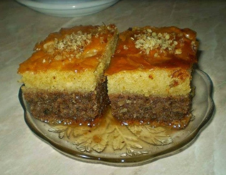 Sipati na polupečeno testo i ispeći kolač. Skuvati sirup od šećera, vode i limuna sečenog na kolutove(ne dugo, nekoliko minuta). Vrućim sirupom preliti vruć kolač. Pospite mljevenim orasima