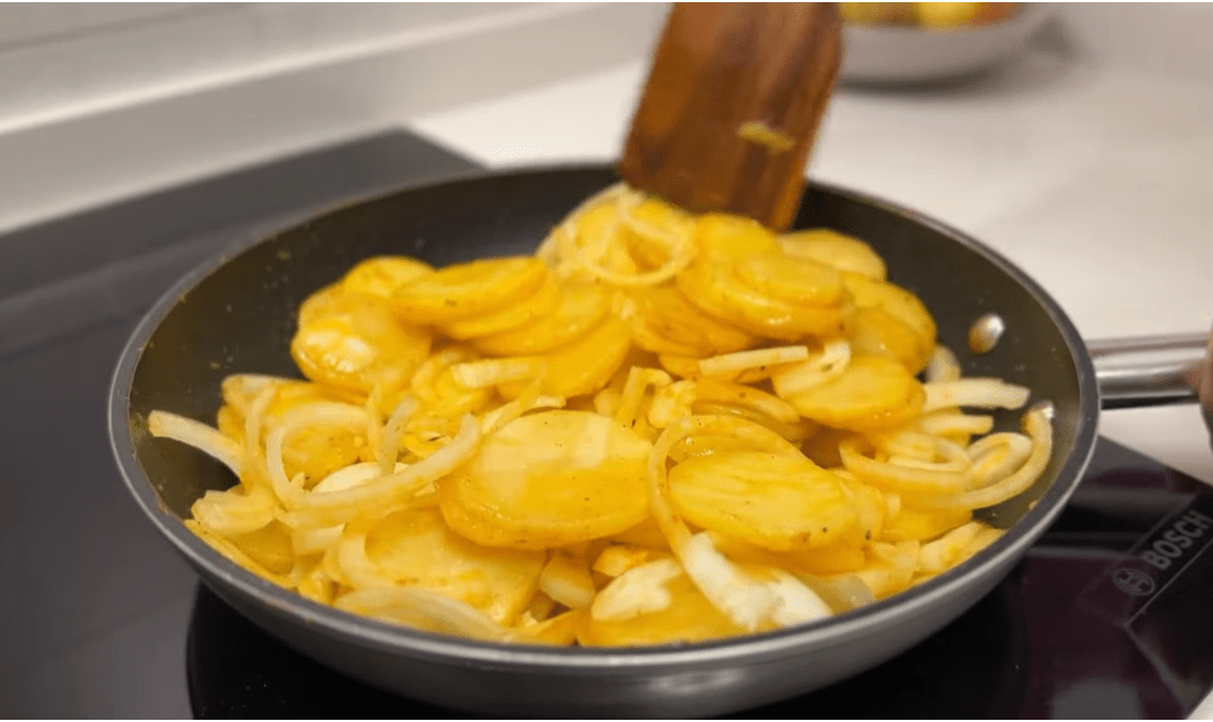 Prvo zagrijte rernu na 190 stupnjeva onda krumpir ogulite i narežite na tanke ploške, dok luk također narežite na tanke kolutove. Ovo je važno jer će tanji slojevi povrća ravnomjernije upiti tekućinu i začine tijekom pečenja, što rezultira savršeno pečenim složencom.