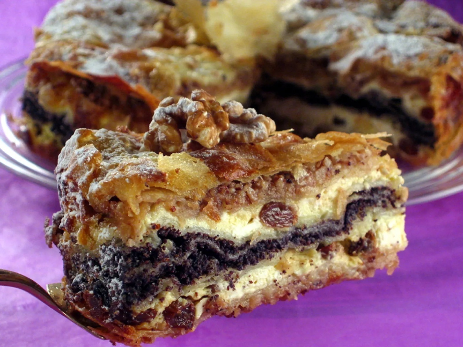 Onda ponovo stavite list tijesta pa polovicu maka koji ste vec samljeli, list tijesta pa postupak ponovite obrnutim redom,odnosno ponovo red maka onda nadjeva od ravljeg sira, jabuka i zavrsite orasima.