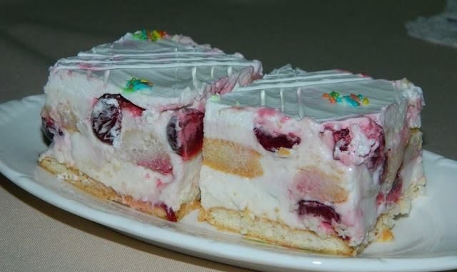 Preko keksa nanesie polovinu kreme pa polovinu visanja a zatim poredajte piskote kratko natopljene u soku.
