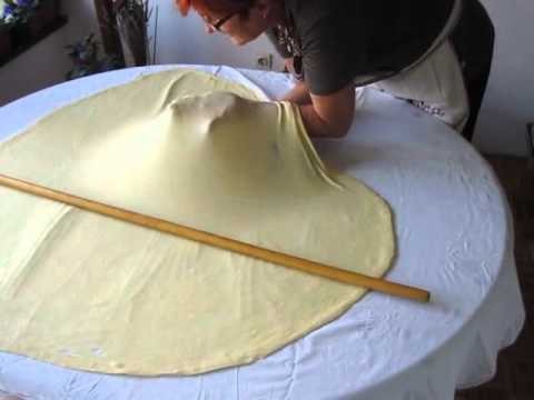 Stolnjak pospite brasnom, tijesto stavite u sredinu i valjkom ga malo razvaljajte. Tijesto za savijacu prvo razvlacite rukama ispod tijesta pa rukama izvlacite tijesto sa svih strana od sredine prema vani dok ne postane skoro prozirno.