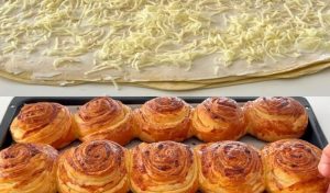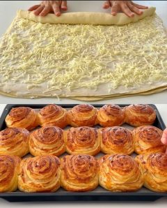 Naslojeno testo se zatim pažljivo uvija u oblik valjka, poput rolata. Dobijena cjepanica se seče na komade širine otprilike dva prsta. Ove komade poredajteu pleh oblozen pek papirom, sa manjim razmakom između njih. Pre pečenja, potrebno je ostaviti ih da odmore još petnaestak minuta, kako bi dodatno narasli.