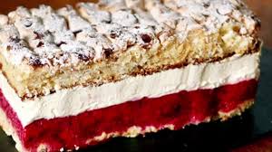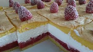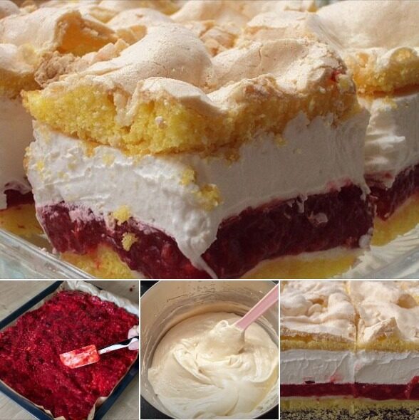 Krema od malina daje divan kontrast biskvitu – kiselo-slatki sloj osvežava i izbalansira bogatstvo beze kore. U šerpu sipajte veći deo voćnog soka od narandže (oko 800 ml), a preostali deo pomešajte s praškom za puding i šećerom. Kada sok provri, dodajte maline – mogu biti sveže ili zamrznute. Kuvajte kratko, tek minut, kako bi ostale delimično cele. Nakon toga dodajte puding smesu i mešajte dok se ne zgusne. Još dok je toplo, prelijte kremu preko cele donje kore. Ostavite da se potpuno ohladi pre dodavanja sledećeg sloja.