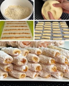 Tijesto je najbolje mesiti rukama, sve dok se ne oblikuje u kompaktnu masu koja se ne lijepi za prste. Kada se to postigne, tijesto treba ostaviti da odstoji nekih 10tak minuta. Nakon toga, radna površina se blago pobrašni, i testo se razvija oklagijom u oblik pravougaonika. Kada set tijesto razvljali nožem ga podijelite na 5 jednakih djelova tj. traka. Na sredinu svake trake postavlja se fil po izboru. U našem slučaju je to dže, od kajsije. Vi možete puniti čime želite pa pokušajte i javite kako vam je ispalo.