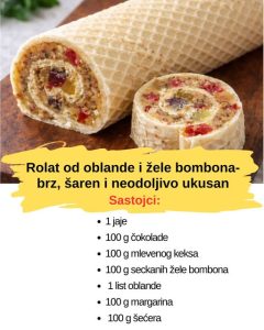 Poslije toga, u smesu se dodaje mleveni keks, koji postepeno zgušnjava fil i daje mu stabilnost. Onda se umešaju sitno seckane žele bombone, koje ovom rolatu daju prepoznatljiv izgled i zanimljiv kontrast u ukusu. Sve se dobro promeša dok se ne dobije gusta, ali maziva smesa, koja se lako razmazuje po oblandi.