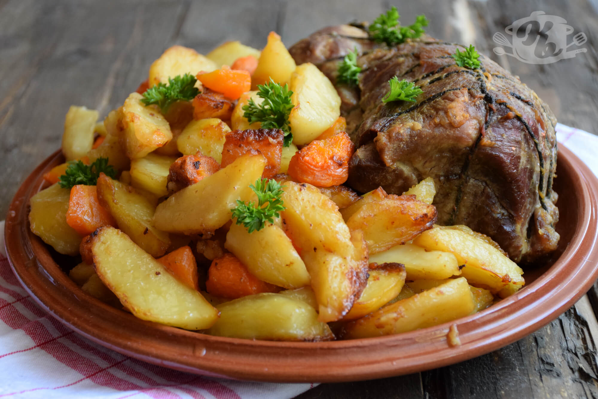 Okolo svinjskog vrata poredajte krompir i mrkvu te jos malo pouljite.
