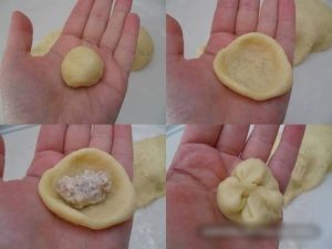 Kada je testo dovoljno naraslo, istrese se ponovo na radnu površinu i blago premesi. Od testa se oblikuju male kuglice, veličine oraha. Svaka kuglica se zatim rastanji na dlanu ili na stolu, a u sredinu se stavlja pola kašičice fila. Zatim se krajevi spoje tako da se formira mali „paketić“. Neki vole da fil ostane malo vidljiv – kao što ime sugeriše, prilikom pečenja testo se „otvara“ i otkriva sadržaj, baš kao što se latice ruže otvaraju.