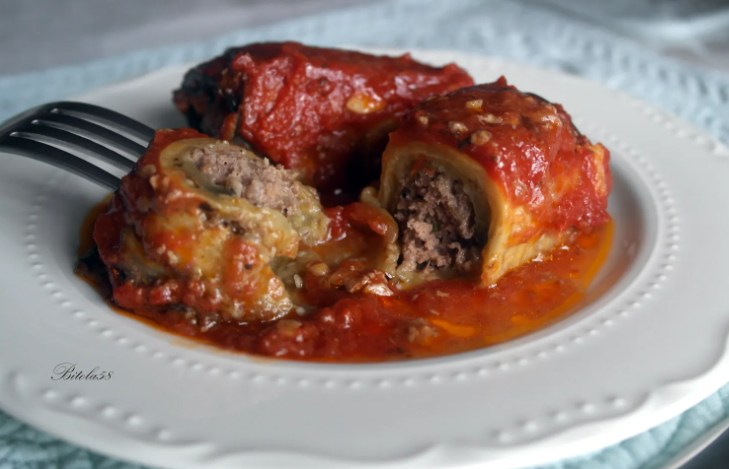 Mjesavinu mesa podijelite na toliko djelova koliko ima i patlidzana. Na svaki patlidzan stavite po lopticu tijesta i zarolajte.