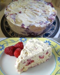 I za kraj treći dio šlaga iskoristite za gornji sloj torte. Rasporedite ga preko sloja sa malinama, trudeći se da sve izgleda uredno i glatko. Ako želite, možete ovaj sloj dekorisati dodatno – recimo, posipanjem komadića keksa, svežim voćem, ili čak listićima bele čokolade za dekoraciju.