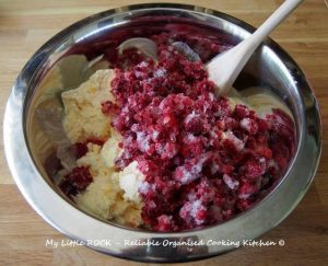 U drugi dio šlaga dodajte smrznute maline. Maline ne morate prethodno odmrzavati jer će se ionako opustiti dok se torta hladi i steže. Pažljivo sjedinite šlag s malinama tako da voće ostane u komadima i ravnomerno raspoređeno. Ovaj voćni sloj nanesite direktno preko baze koju ste prethodno poravnali. Ponovo koristite špatulu kako biste sloj izravnali.
