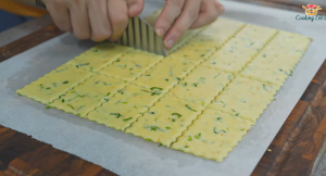 Kada je tijesto odmorilo izvadite ga na lim obložen papirom za pečenje. Preko tijesta stavite još jedan list papira i dlanovima ga lagano pritisnite da se spljošti. Potom upotrijebite valjak da ga razvijete u što tanji pravougaonik – tanje tijesto znači hrskavije krekere, što je i cilj. Kada ste tijesto razvaljali uzmite nož za plisiranje i podijelite tijesto na jednake komade. Prije nego što stavite peći krekere svaki omad krekera izbockajte sa viljuškom kako vam sw tijesto ne bi dizalo tokom pečenja.