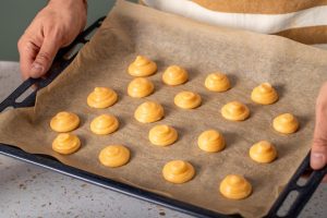 Pripremite pleh i obložite ga papirom za pečenje. Koristite poslastičarski špric s okruglim nastavkom i oblikujte male kružiće promjera oko tri centimetra. Ako se formira vrh, prstom umočenim u vodu poravnajte ga da ne izgori tokom pečenja. Pošpricajte tijesto vodom kako biste u rerni stvorili paru koja pomaže krafnama da narastu bez pucanja. Peče se u prethodno zagrejanoj rerni – prvo na 200°C oko 20 minuta, zatim se temperatura smanjuje na 170°C i peče se još 10–15 minuta dok ne dobiju zlatnosmeđu boju. Nakon pečenja ih treba prebaciti na rešetku i potpuno ohladiti pre nego što se filuju.