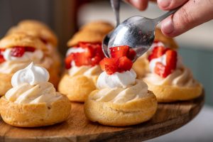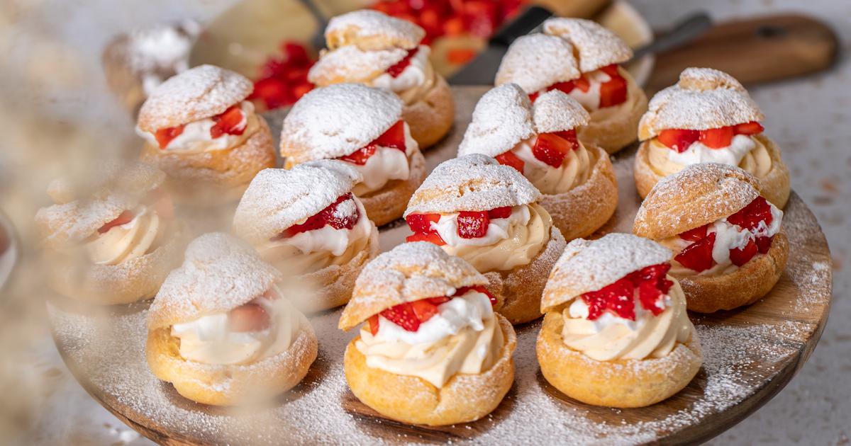 U međuvremenu se priprema šlag tako što se slatko vrhnje tuče sa šećerom u prahu dok ne postane čvrsto. Ohlađena krema se još jednom izmiksa da postane svilenkasta, pa se pažljivo sjedini sa šlagom pomoću špatule. Jagode, koje daju osvežavajuću voćnu notu, operu se i narežu na sitne komade. Svaka krafna se pažljivo prereže, pa se redom puni slojem kreme, zatim se stavlja šlag i na kraju voće. Na sve to se doda poklopac od tijesta i pospe šećerom u prahu za dekoraciju.