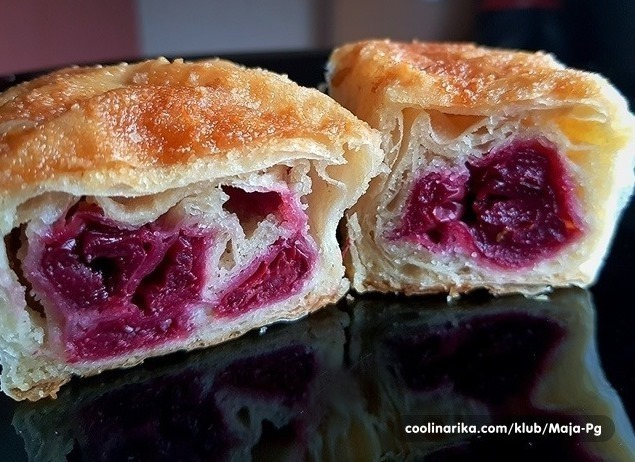 Uzmite kore za pite. prvu koru namazite smjesom od griza,stavite drugu koru koju takodjer namazete smjesom. Stavite trecu koru na koju rasporedite visnje. Sve fino zarolajte i slozite u namasceni lim za pecenje.
