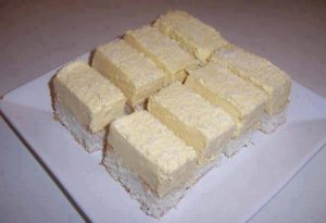 Za kore u nekoj većoj posudi sjedinite jogurt, kokosovo brašno, šećer, griz i prašak za pecivo. Nema potrebe za mikserom – obična varjača ili žica za mućenje je dovoljna. Kada dobijete kompaktnu smesu, sipajte je u pleh veličine 21×30 cm, koji ste vec podmazali i posuli brašnom. Stavite pleh u vec zagrijanu rernu na 180 stupnjeva oko 20-ak minuta.