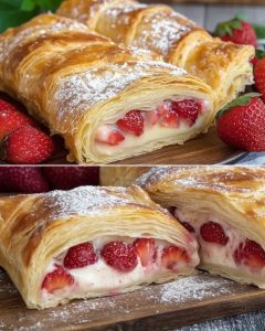 Pripremite lisnato tijesto – ono treba biti pravokutnog oblika, s dužom stranom okrenutom prema vama. Ako je potrebno, tijesto blago razvaljajte. Na sredinu tijesta stavite ohlađenu kremu u traku širine oko 7,5 cm, ostavljajući dovoljno prostora s bočnih i gornjih/donjih rubova kako biste tijesto mogli preklopiti. Preko kreme rasporedite ocijeđene jagode, a zatim dodajte komadiće savoiardi keksa.