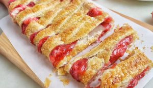Ostavite kremu da se hladi a vi pocnite sa pripremom nadjeva od jagoda. Operite jagode i očistite od peteljki pa narezite na komade. Onda ih stavite u tavu s šećerom u prahu i naribanom limunovom koricom. Kratko ih kuhajte, tek toliko da omekšaju i puste sok, ali zadrže oblik. Nakon kuhanja ih procijedite pomoću rešetkaste žlice kako biste uklonili višak soka – ovo je ključno da se tijesto ne razmoči prilikom pečenja.