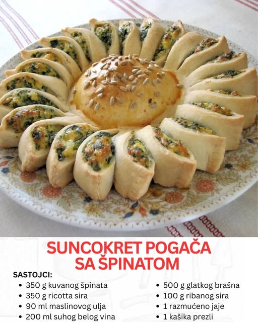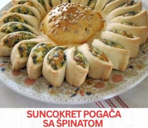 Pre pečenja, sredina pogače se još jednom premaže razmućenim jajetom i pospe sjemenkama suncokreta. Pogaču pecite u prethodno zagrijanoj rerni na 180 stepeni oko pola sata. Pogača treba da dobije zlatko smeđu boju . Nakon pečenja ostavite da se malo prohladi a zatim je poslužite i uživajte u izvanderdnom ukusu.