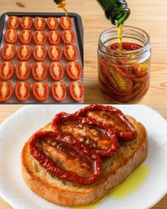 Sljedeći korak je sušenje u rerni. Rerna se zagreva na 120 stepeni , što je niska temperatura pogodna za dugotrajno pečenje. Paradajz se stavljaju u rernu i peče oko 8 sati. Možda će trebati peći duže ako su u pitanju velike polovice paradjaz. U tom vremeu pečenja paradajza omogućiti će postepeno isparavanje vode, pri čemu se plod ne isušuje u potpunosti kao u dehidratoru, već ostaje mesnat i blago žvakaći. Idealno sušeni paradajz izgleda tamnije, zbijeno, ali nisu ni prepečeni ni hrskavi. Njihova tekstura treba da bude meka, ali dovoljno suva da se ne kvari prilikom čuvanja.