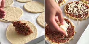 Povrće se sitno nasjecka, a luk po želji može i naribati, što daje intenzivniju aromu. Sve se to miješa s mljevenim mesom, dodaju se začini, ulje i voda, te se formira kompaktnija masa spremna za punjenje. Svaki izrezani krug tijesta puni se sa po jednom velikom žlicom nadjeva. Prstima se masa rasporedi tako da se pokrije veći dio tijesta, ostavljajući rubove slobodnima radi lakšeg oblikovanja ili zatvaranja, ukoliko se tijesto preklapa. Povrh nadjeva stavlja se malo ribanog cheddar sira koji tokom pečenja topi i prodire u slojeve, dajući bogat, kremasti dodatak mesu.