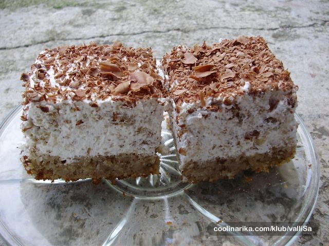 Peceni i ohladjeni biskvit rezite po pola. Gornju polovicu biskvita izmrvite i pomijesajte sa tucenim slatkim vrhnjem. Mazite po donjoj polovici biskvita.