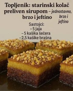 Kada je smesa gotova, nasipite u vec podmazan pleh i pecite na 180 stupnjeva dok ne dobije lijepu zlatno-smedju boju. Pečenje može trajati oko 20-30 minuta, u zavisnosti od rerne. Nakon što se kora ispeče, ostavlja se da se potpuno ohladi pre nego što se prelije sirupom.