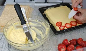 Zatim se priprema slatka pavlaka. Umutite 300 mililitara pavlake dok ne postane čvrsta, vodeći računa da ne premutite kako ne bi postala zrnasta. Isecite 300 grama svežih jagoda na tanke kolutove ili po želji.