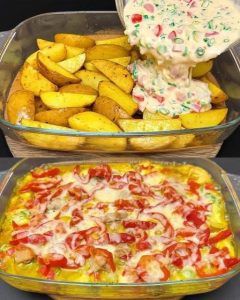 Kada je krumpir pečen i lijepo zapečen, izvadite ga iz pećnice. Preko vrućeg krumpira ravnomjerno rasporedite pripremljeni preljev. Pokušajte ga nanijeti tako da prekrije većinu površine, kako bi svaki zalogaj bio bogat okusima.