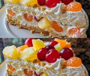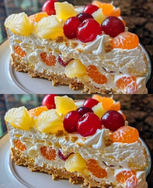 U hlađenu smjesu umiješajte grožđe, mandarine, maraskino trešnje i po želji orahe. Na kraju, pažljivo umešajte umućeni šlag. Koristite spatulu i lagane pokrete kako biste zadržali prozračnost smese. Kada ste odradili sve pripreme slijedi spajanja komponenti. Pripremljeni fil ravnomerno izlijte preko kore u kalupu. Poravnajte vrh špatulom da dobijete uredan završetak. Pokrijte kolač plastičnom folijom i stavite ga u frižider. Ostavite da se steže minimum 6 sati, a idealno je da prenoći.