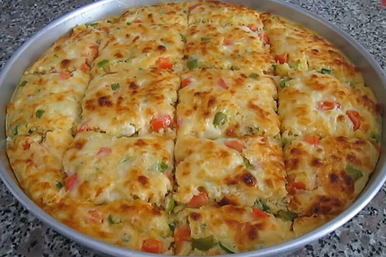 Kalup prečnika 32 cm premažite puterom. Sipajte smjesu, pospite rendani sir preko i pecite na 200 stupnjeva nekih 30-35 minuta.