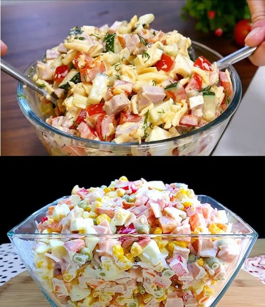 Kada su svi sastojci pripremljeni, prelazi se na sastavljanje salate. U velikoj zdjeli sjedinite narendanu šargarepu, usitnjena jaja, kockice šunke i papriku. Na to dodajte grašak i kukuruz. Pažljivo sve promiješajte kako bi se sastojci ravnomjerno rasporedili. Veoma je važno da se salata miješa lagano, kako se ne bi narušila tekstura sastojaka – posebno jaja i šunke, koji su mekši.