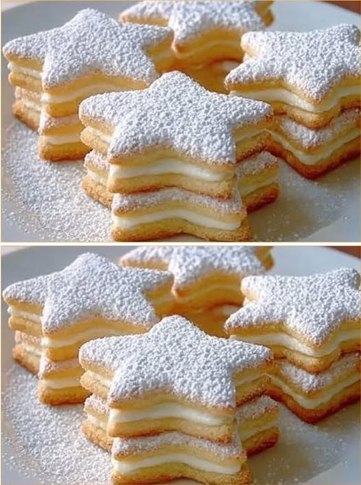 Kada su svi elementi spremni, pristupa se sastavljanju kolačića. Na jednu pečenu zvjezdicu nanosi se tanak sloj kreme, zatim se preklapa drugom zvjezdicom i lagano pritisne kako bi se spojile. Na kraju se kolačići posipaju šećerom u prahu, što im daje elegantan završni izgled.