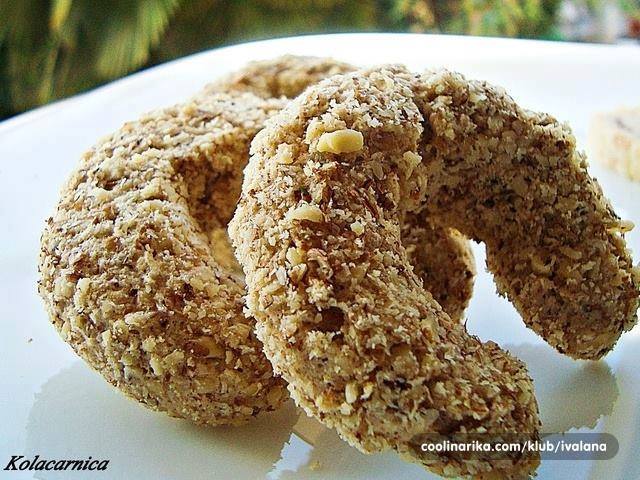 Pravite kiflice i svaku kiflicu uvaljajte u sjeckane orahe. Pecite u plehu oblozenoim papirom za pecenje na 180 stupnjeva oko 35 minuta.
