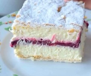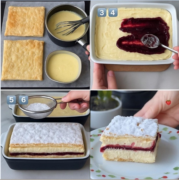 ZA slaganje kolača koristite dublji pleh. Na dno pleha se stavlja prva pečena kora, preko koje se u ravnomernom sloju raspoređuje polovina vanila kreme. Zatim dolazi voćni žele, pa drugi deo kreme koji obavija voće i spaja ukuse. Na samom kraju sve se prekriva drugom korom od lisnatog testa. Pre služenja, kolač se obilno pospe šećerom u prahu kako bi dobio dekorativan i elegantan završni izgled.