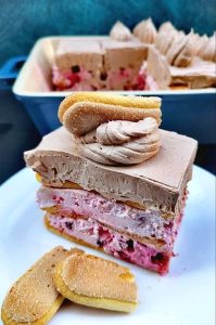 Red umučenih, natopljenih piškota postavite na dno posude. Pokrijte ih sa polovinom kreme od pavlake i šumskog voća. Poravnajte kremu spatulom. Ponovite red piškota, opet ih blago umačući u sok, i potom dodajte ostatak kreme. Ravnomerno je rasporedite po površini. Treći i poslednji sloj čine ponovo piškote, koje će poslužiti kao osnova za završnu dekoraciju.