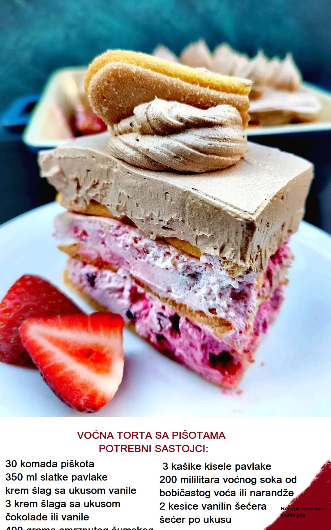 Dok krema kratko odstoji da se sjedini, pripremite piškote. U plićoj posudi sipajte voćni sok i pripremite se za ređanje. Svaku piškotu kratko umočite u sok dovoljno je da ih kratko zaronite, tek da omekšaju, ali ne toliko da se raspadnu. Idealne dimenzije su otprilike 21 x 21 cm, a možete koristiti i nešto dublju keramičku činiju. Bitno je da posuda bude dovoljno duboka da može da primi najmanje tri sloja – dva sloja kreme i tri reda piškota.