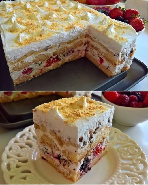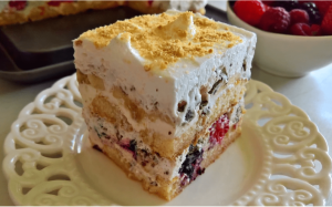 Na sloj od kreme stavite red voca. Maline i kupine su idealan izbor jer svojom blago kiselkastom notom osvežavaju kremastu osnovu. Naravno, izbor voća može biti fleksibilan, pa se mogu koristiti i jagode, borovnice, ili čak ananas.