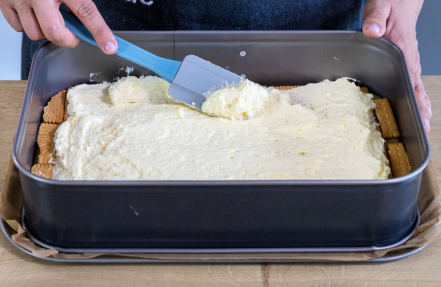 Prvo preko keksa premazite bijeli fil i lijepo ga poravnajte uz pomoc spatule Preko pazljivo nanesite cokoladni fil pa odozgo poredajte jos jedan red keksa.
