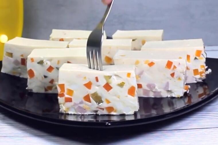 U toplu smjesu dodajte majonez i malo soli dobro umutite mikserom. Dodajte sitno sjeckane: jaja, mrvku, sunku i krastavce.