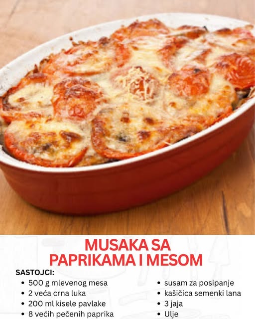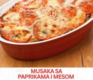 Kada ste sve priprmeili sada je na red došlo slaganje musake. Redate na sljedeći način. U nauljenu vatroslanu posudu redajte prvo sloj pečenh paprika zastim ćete staviti kompletnu smjesu mesa pa polovicu smjesu od jaja i pavlake. Preko toga ide opet red paprika i na kraju se izljeva ostatak smjese sa prelivom od jaja.