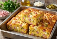 Sljedeći korak je priprema preliva. U zdjeli se najprije umute jaja, zatim se dodaje so i kisela pavlaka. Smijesa treba da bude glatka i ujednačena, jer će upravo ona povezati sve slojeve i stvoriti mekan, kremast završetak sa zlatnom koricom.