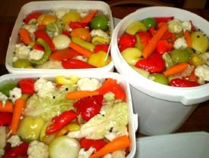 Kada ste priprmili povrće uzmite veću stakleu ili plastičnu posusu. U nju stavite kesu koja je veća od zdjele kako bi vam krajevi bili izvan posude. Ja vam ovdje govorim svoj redoslije slaganja povrća a vi opet možete kako vi želite. Prvo na dno stavim krastavce zatim luk, papriku, paradajz i na kraju karfiol. NAstavite redoslijed dok ne potrošite svo povrće.